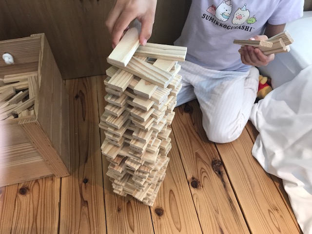 グランピングの部屋には他にも木の素材の積み木があり、子供たちも楽しそうに遊んでいました。