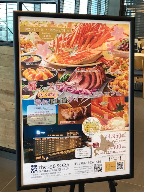 ここからは、The358 SORAに宿泊したので、UMIとの違いの詳細に加え、SORAのディナービュッフェの口コミ、周辺の食事情報に加え、博多駅までの時間をご紹介します。※内容は宿泊当時のものになります。